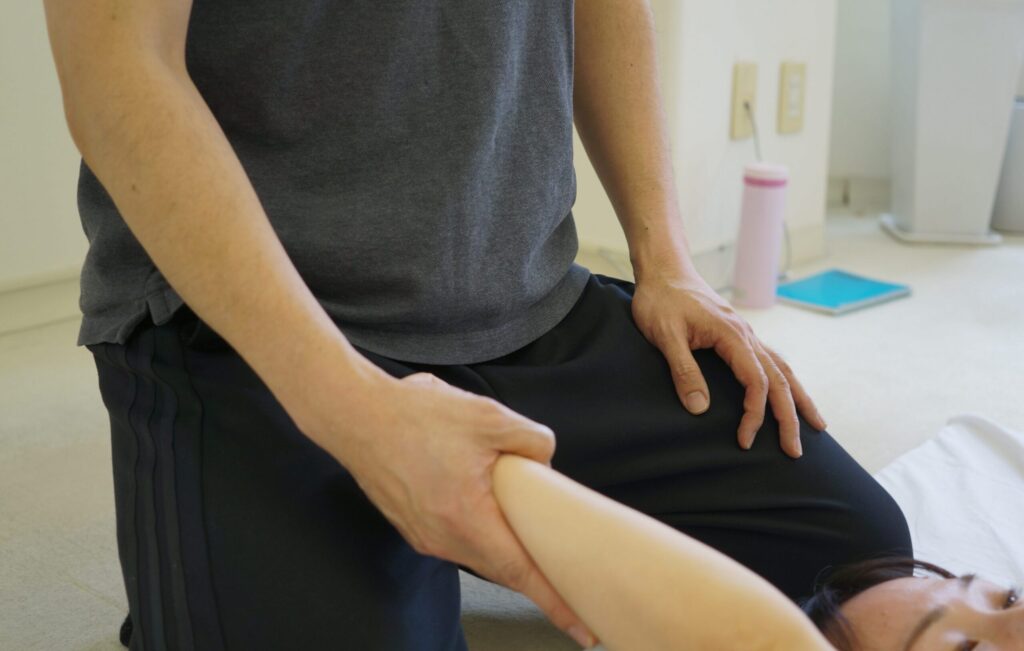 この2つの変化を確認できたら、肩の関節可動域を広げるように慎重に手技をかけてください。